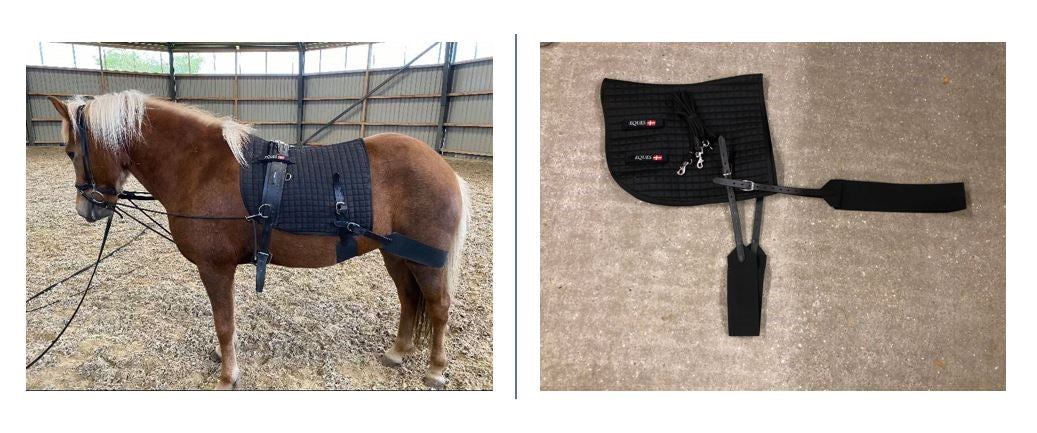 To elastiske bånd aktiverer henholdsvis hestens bagben og core (krops-kernemuskulatur).