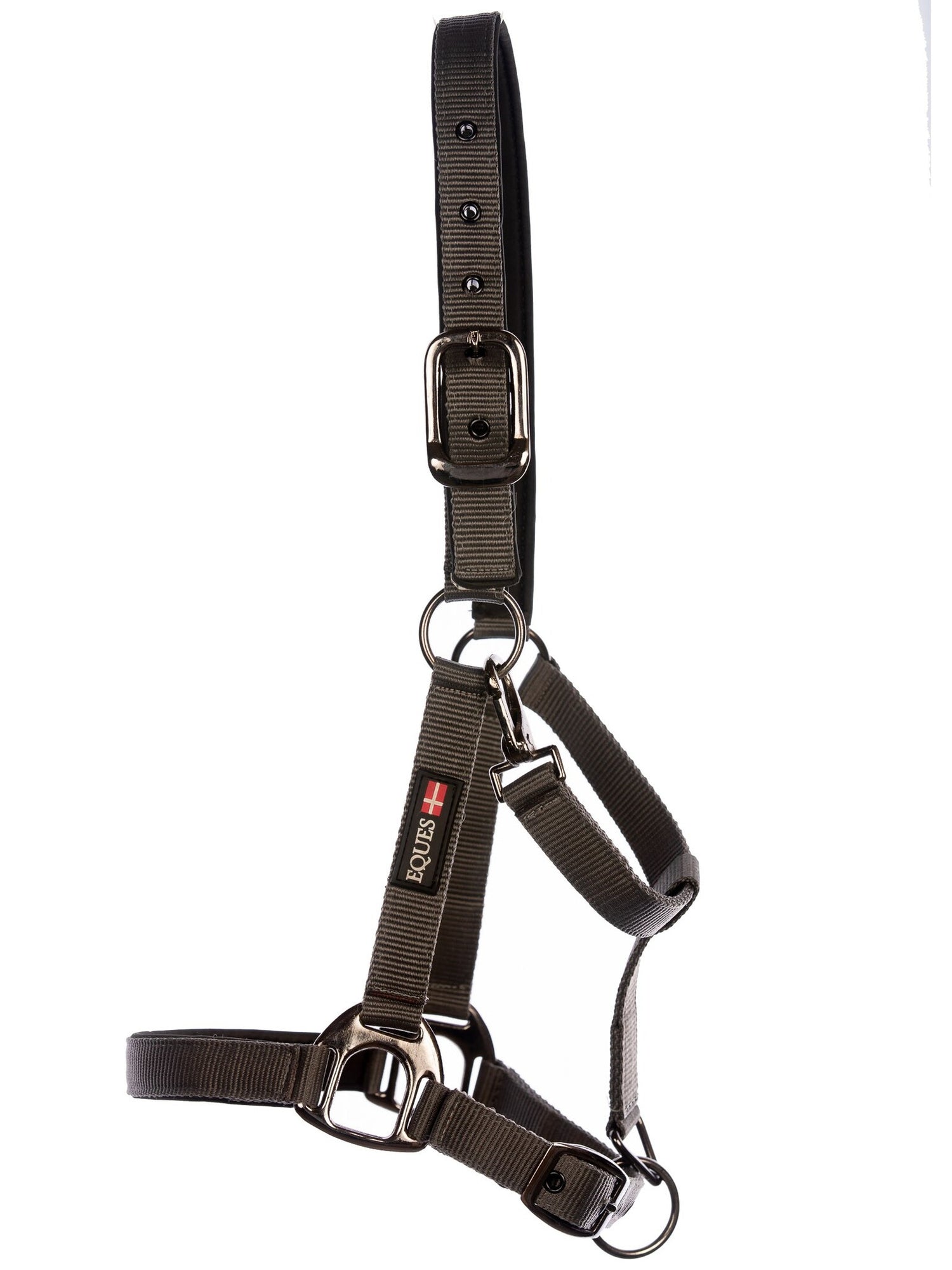 Grime i grå farve - matcher dækken - med spænder i platinmetal. Indstillelig ved nakke og under hage. Str islandsk hest.