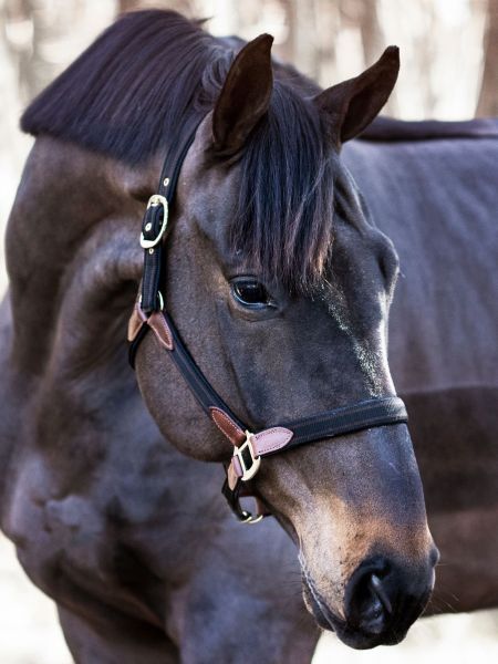 Skøn grime i nylon og med blød neoprenforing. Læder ved alle forbindelser til ringe og spænder.