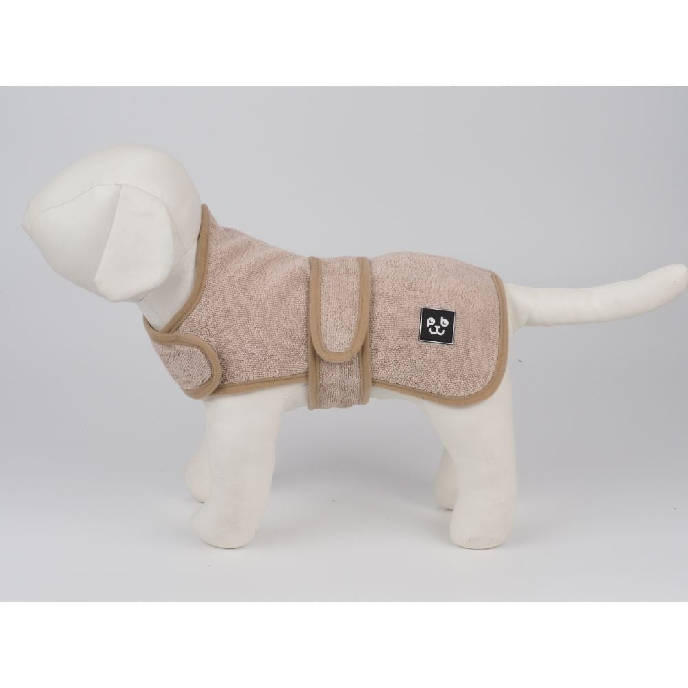 Badekåben er lavet af håndklæde stof som absorberer vand når kæledyret er vådt. Justerbar bælte omkring hals og mave med velcro lukning. Kan vaskes ved 30 grader.