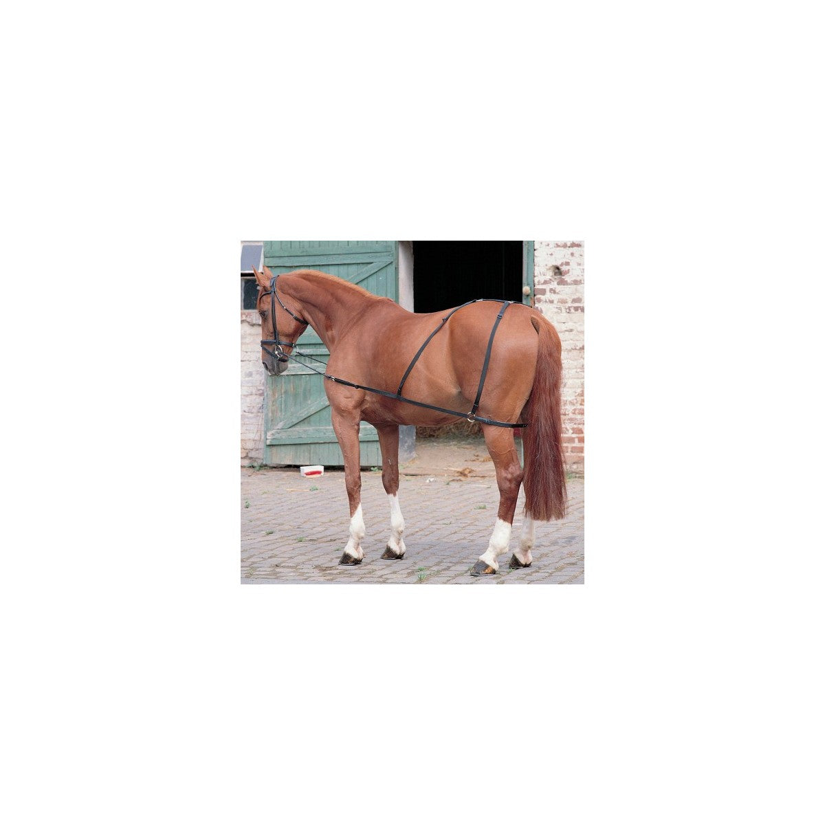 Combi Trainer, ativerer hestens bagpart. Ideel til longering og ridning. Blødt materiale med elastik i de forreste dele. Leveres uden bid og hovedtøj.